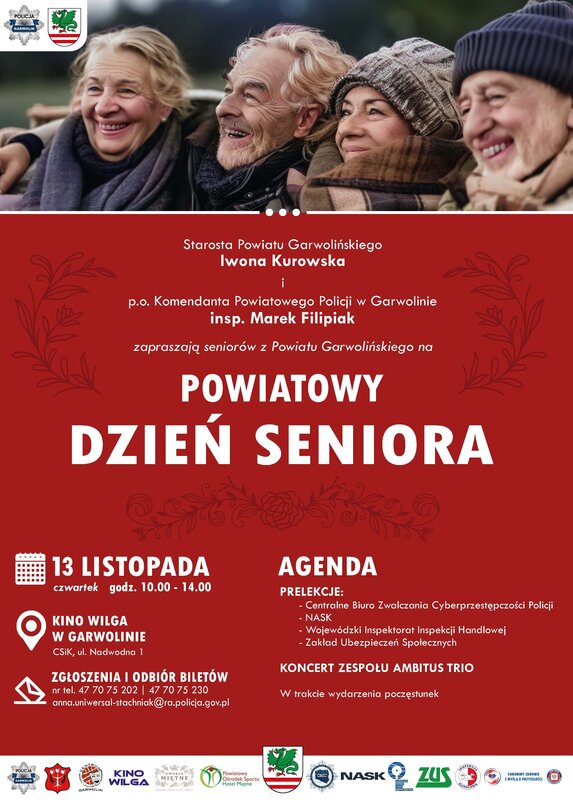 Już 13 listopada Kino Wilga w Garwolinie zamieni się w miejsce pełne pozytywnej energii, muzyki i inspirujących rozmów. Starosta Powiatu Garwolińskiego Iwona Kurowska oraz p.o. Komendanta Powiatowego Policji w Garwolinie insp. Marek Filipiak zapraszają wszystkich seniorów z powiatu na wyjątkowe wydarzenie – Powiatowy Dzień Seniora. Spotkanie odbędzie się w czwartek w godzinach od 10:00 do 14:00 w sali Kina Wilga (CSiK, ul. Nadwodna 1).