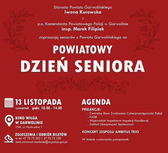 Już 13 listopada Kino Wilga w Garwolinie zamieni się w miejsce pełne pozytywnej energii, muzyki i inspirujących rozmów. Starosta Powiatu Garwolińskiego Iwona Kurowska oraz p.o. Komendanta Powiatowego Policji w Garwolinie insp. Marek Filipiak zapraszają wszystkich seniorów z powiatu na wyjątkowe wydarzenie – Powiatowy Dzień Seniora. Spotkanie odbędzie się w czwartek w godzinach od 10:00 do 14:00 w sali Kina Wilga (CSiK, ul. Nadwodna 1).