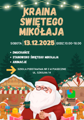 13 grudnia 2025 r. w Szkole Podstawowej nr 5 w Piasecznie odbędzie się „Kraina Świętego Mikołaja” – wydarzenie przygotowane w ramach Budżetu Obywatelskiego 2025. Dzieci będą mogły spotkać Świętego Mikołaja, skorzystać z dmuchańców oraz wziąć udział w świątecznych animacjach, a wszystkie atrakcje dostępne będą bezpłatnie. Impreza potrwa od godziny 10.00 do 18.00 przy ul. Szkolnej 14. Dodatkowe aktywności dla najmłodszych zapewni Rada Rodziców SP 5.