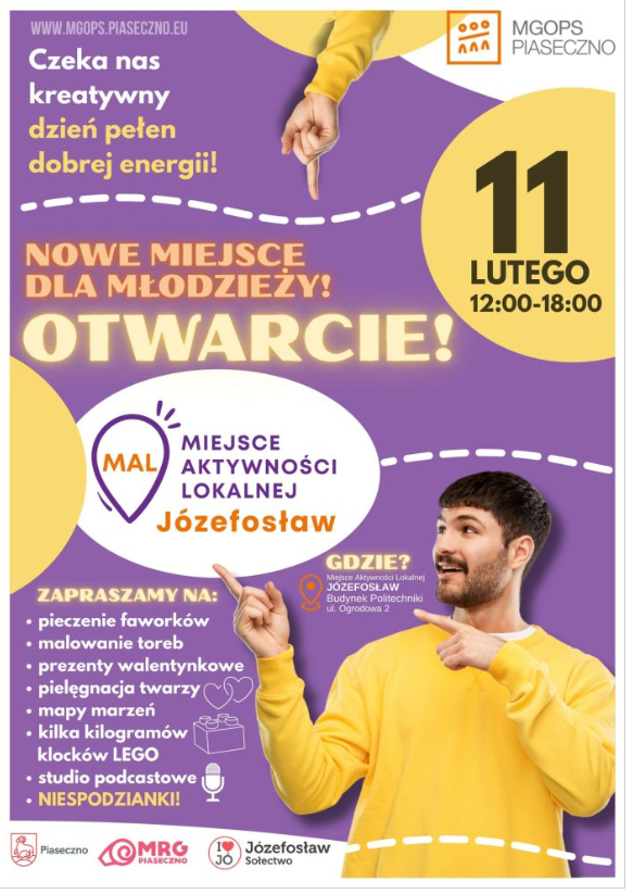 Na mapie Józefosławia pojawia się nowe miejsce integracji i lokalnych inicjatyw. Miejsko-Gminny Ośrodek Pomocy Społecznej w Piasecznie otwiera Miejsce Aktywności Lokalnej MAL Józefosław – przestrzeń stworzoną z myślą o mieszkańcach w każdym wieku. Oficjalne otwarcie zaplanowano na 11 lutego 2026 roku.